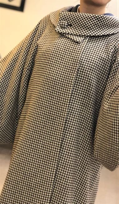 今回ご用意している素敵なあったかコートを何点か試着してみました。その中から、今日はロールカラーのチエックのコート。へちま衿のモザイク模様のコート。レースとアンゴラのマント。の三点をご紹介します。