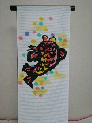 絽塩瀬の生地に荒磯ををモダンに描いています。荒磯柄は名物裂に見られる波間に踊る鯉を織り出している柄で、小物などにもよく見られる柄です。その昔からの柄を、カラフルな色使いで表現しています。