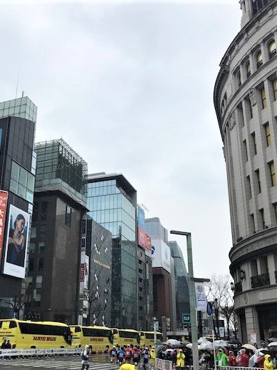 アップルストアの前、四丁目の交差点の和光の前をぐぐっと曲がっていきます。この時間は、トップランナーの人たちなので、とにかく早い。びゅーんとすごい勢いで走っていきます。