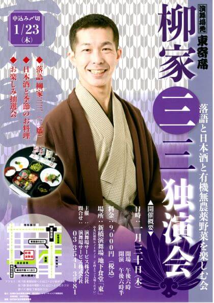 笑って、泣いて!?素敵なひとときを味わっていただける柳家三三さんの落語と、美味しい日本酒、有機無農薬野菜を一度に楽しんで頂けますよ♪
