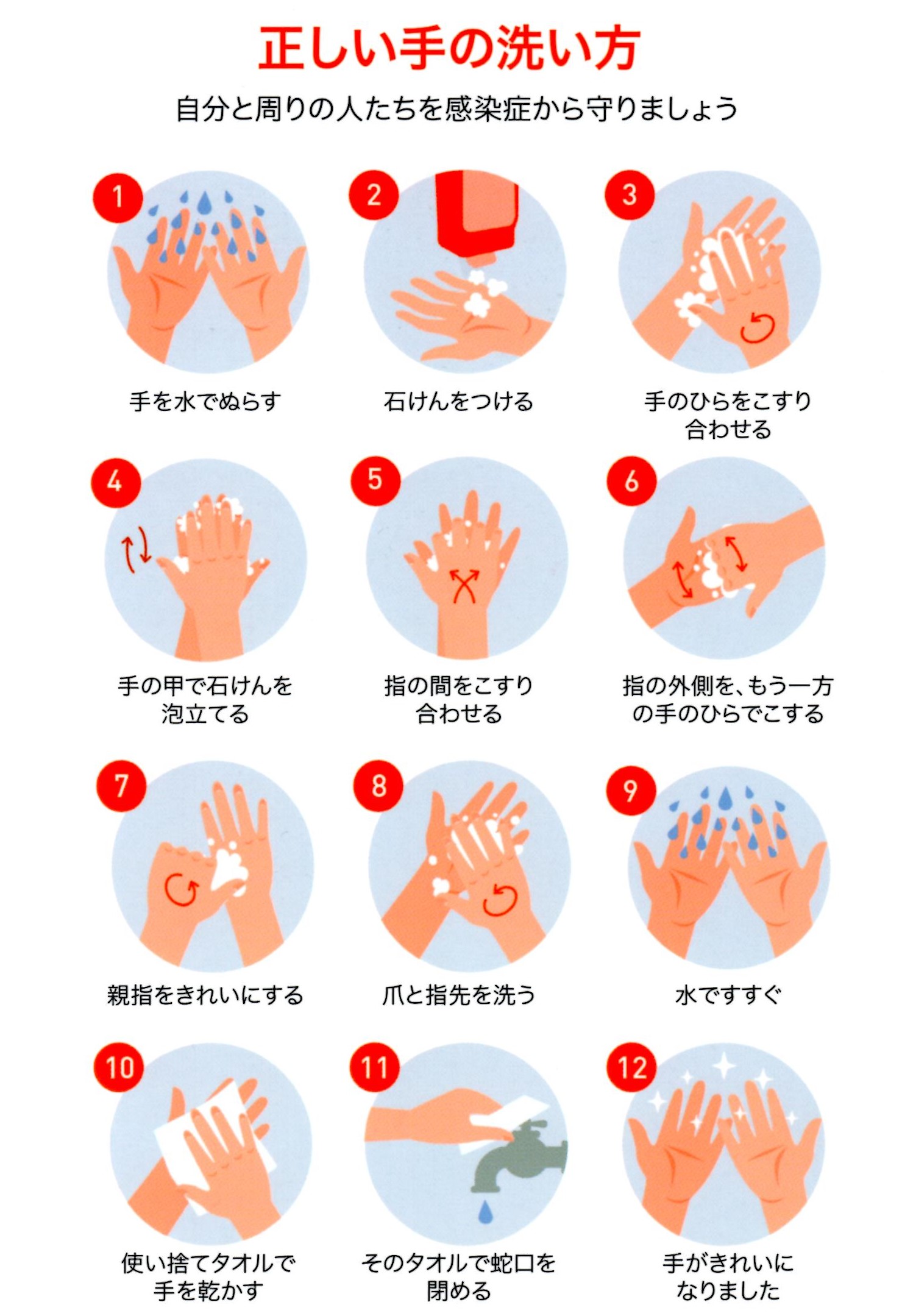 石鹸を使って30秒の手洗いをしっかりしていきましょう。この30秒ですが『ハッピーバースデー』の歌を二回歌いながら洗うと丁度いいらしいですよ。毎日名前を変えて、いろんな人のお誕生日をお祝いしながらの楽しい手洗いがいいですよ♪