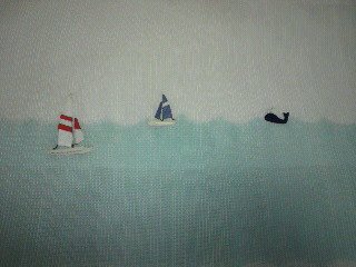古布で作られた灯台や気球、とおくに飛び立つ飛行機も見えますね。私のおすすめは、浜辺のヤドカリ君とカニさんです!赤いカニさんの微妙な色の加減は本物のようですよ。