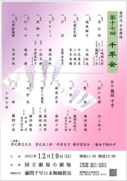 このブログでお教室をご紹介させていただいている藤間駒季さんの師匠である藤間千早先生が会主をされる『第十七回 千早会』が開催されます。