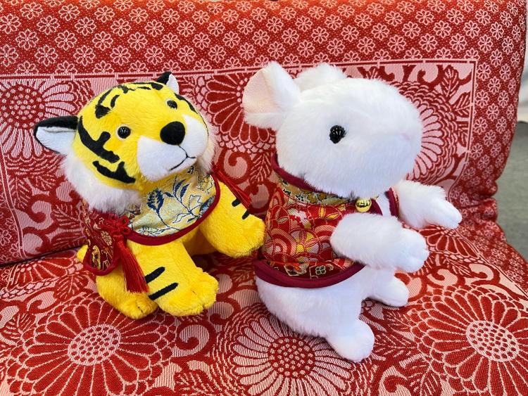 龍村美術の干支マスコットが届いたので、干支交代タッチの儀式!?を今年も早めに開催しちゃいました。2022年の寅さんから2023年の兎さんへバトンタッチしてもらいましたよ。