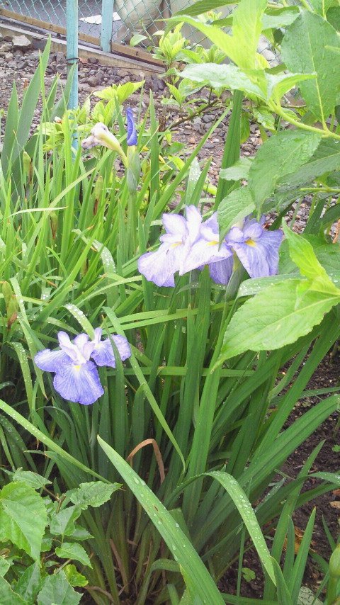 雨がぽつぽつ降る中、りきちゃんとぎんちゃんは少しテンション低目で、お散歩開始!いつもとは違う一人と二匹のお散歩道には、貨物専用の線路があって、その脇に花菖蒲が!!という事でパチリです。