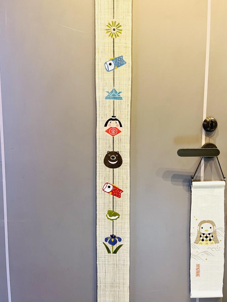 子供の日仕様の可愛いタペストリーを入り口にかけて、お出迎えしております。アマビエちゃんは季節関係なくいつでもいますよ!!