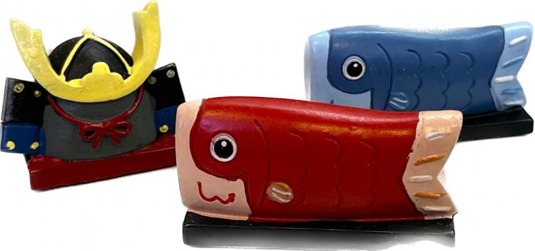 大きなこいのぼりや兜をお店に置くのは難しいので、ちっちゃいこいのぼりさんと兜をテーブルに飾っています。