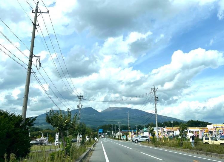雄大な浅間山です。緑のお山と青空に白い雲!!おいしい空気も一緒に届いた感じがします。