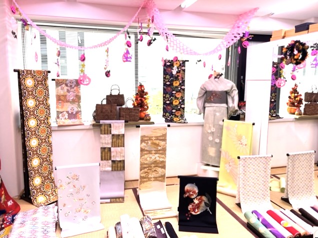 店内は秋のお着物や帯、そしてハロウィン飾りで秋色になっています。
