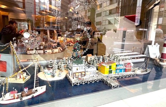 〝きもの白〟の斜め前ににある『王子サーモン』さんのウィンドウが素敵なジオラマで飾られているので今年もパチリ♪してきました。