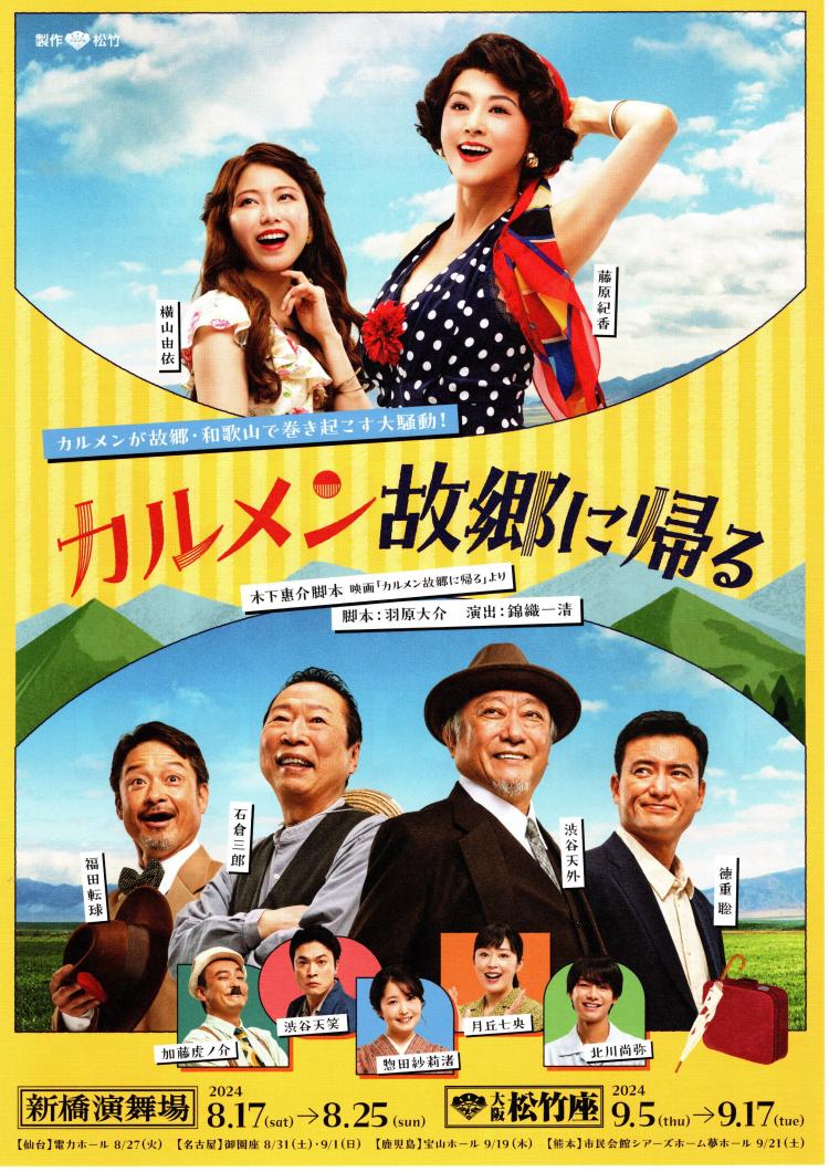 昨日から、新橋演舞場で公演中の『カルメン故郷に帰る』のポスターとチラシが届きました!藤原紀香さんが主演で70年以上前の日本初カラー映画が舞台によみがえる作品です。