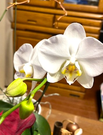 今日プーさん店長さんから届いた写真はお散歩ではなく、お家の胡蝶蘭です。お客様に周年記念に頂いた胡蝶蘭が又咲いてくれたそうです!!