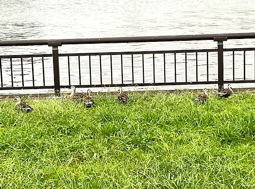 『かもさん達の川辺の井戸端会議』です。皆で何をおしゃべりしているんでしょう?