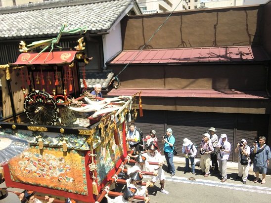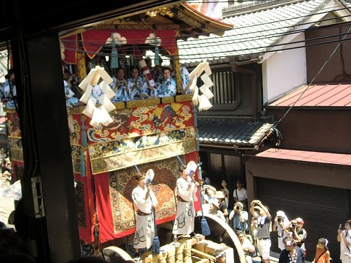 というわけで、千恵子さんのデジカメからケットした祇園祭の重厚の様子を少しご紹介しますね。もちろん最初は、くじとらずで巡行の先頭を行く長刀鉾です!!特徴は、鉾先に付いている大長刀なのですが、鉾との距離が近すぎて、カメラに写りきらず残念。。。先端までは25メートル近くあるそうなので、遠くからの記念撮影じゃないと、全景は写らないんですよね。でも、この距離ならではの、囃子方さんとの近さはお届けできたのではないでしょうか?あっ、見えてない長刀ですが、今年新調されたらしいですよ!