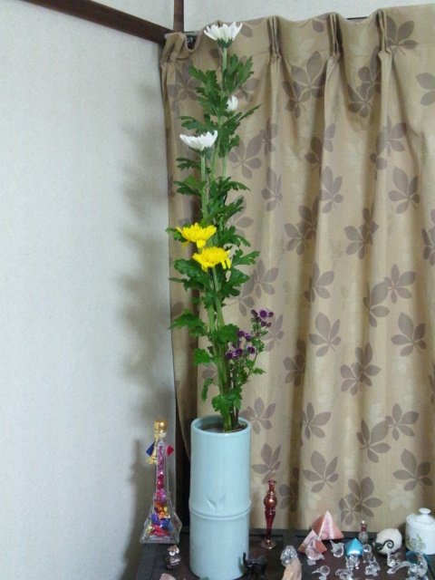 このお花は重陽の節句のお生花(せいか)なんです。9月9日にはお稽古に行けなかったので、いまさらですが・・・。