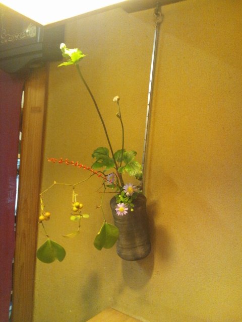 しゅっとのびているのが、秋明菊(しゅうめいぎく)赤いプチプチっと見えるのが水引草、緑の実が付いているのが猿捕茨(さるとりいばら)またの名を山帰来(さんきらい)そして野菊です。秋のお花が素敵に生けられています。