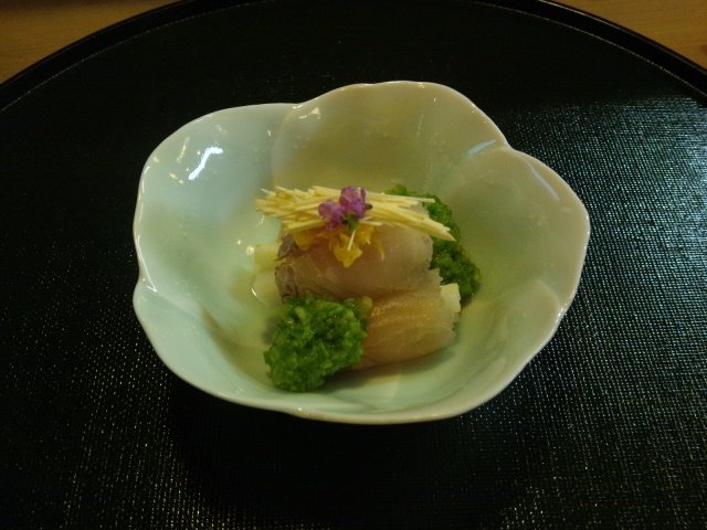 まずは、一番最初に出てきたコチラは、リンゴの短冊を小鯛で巻いて、その上に生栗の千切りとおくらのたたいたものが添えてあります。