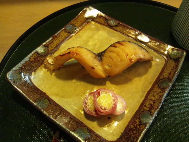 そして、少し飛んで鰆の焼き物。添えてあるのは、茗荷の甘酢漬けです。