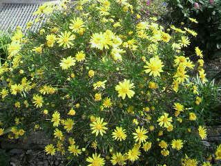 そして、もう一枚は黄色の綺麗なお花です。正解かどうかは微妙なところなのですが、ユリオプスデイジーではないかと・・・。とりあえず、黄色い花が秋の空気の中に綺麗に咲いていたという事で、秋のプーさんぽでした!!