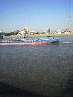 そして、もう一枚は中川を上流から下流へ向かって進んでいく、けっこう大き目な舟です。この船は何を運んでいるかは、やっぱり不明のままなのですが、お散歩中にちょこちょこ見かけるそうです。