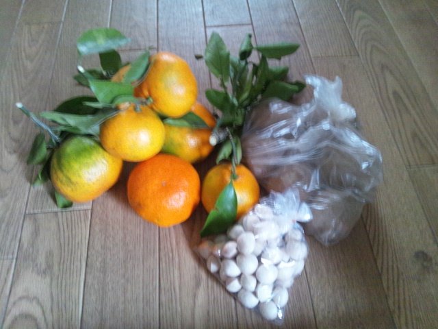 二枚目の写真は、戦利品のみかんとじゃがいもとぎんなんです!