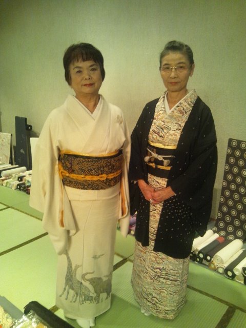 キリンやゾウなどたくさんの動物達が描かれた訪問着をお召しです。素敵な型絵染めの素敵なお着物の上に羽織をお召しです。