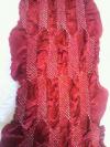 小さく折りたたんだ生地にくるくると糸を巻きつけて絞ってあります。今はまだ絞ってもらったままの状態なので、ギュッと小さくなってますね。これから、巻いている糸を手作業で取っていくんですよ。そうすると糸の巻かれていた所に綺麗な白が現れます!つまり、矢羽さんがもっとはっきり綺麗に出てくるので、地の赤の色が白との対比で、より綺麗になるんですよ。