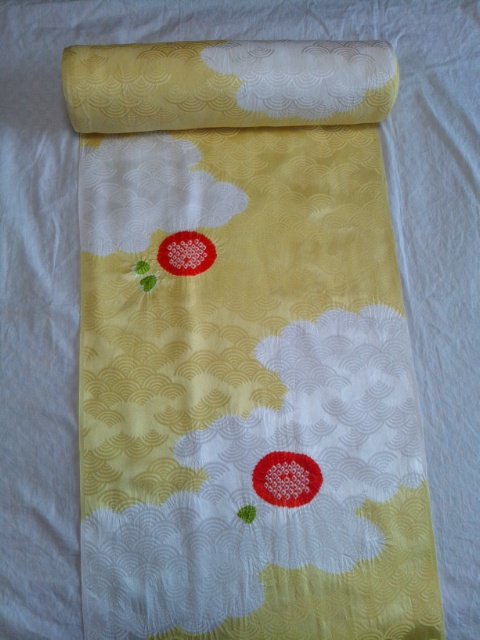 今日は、きれいな色の素敵な絞りの小紋をご紹介します!青海波の地紋の生地に雲どりと菊が絞られています。地の黄色は写真では、すこしくすんだクリーム色っぽいですが、実際はもっと明るくきれいな色なんですよ。