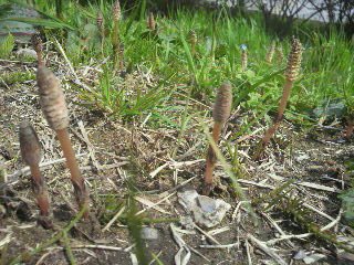 朝のお散歩のときは、いいお天気で気持ち良く一人と二匹のお散歩を楽しんでいたみたいで、春の写真が届きました。、先日もつくしくんは登場しましたが、今日はいっぱいのつくしくんです。かなりニョキニョキですね。