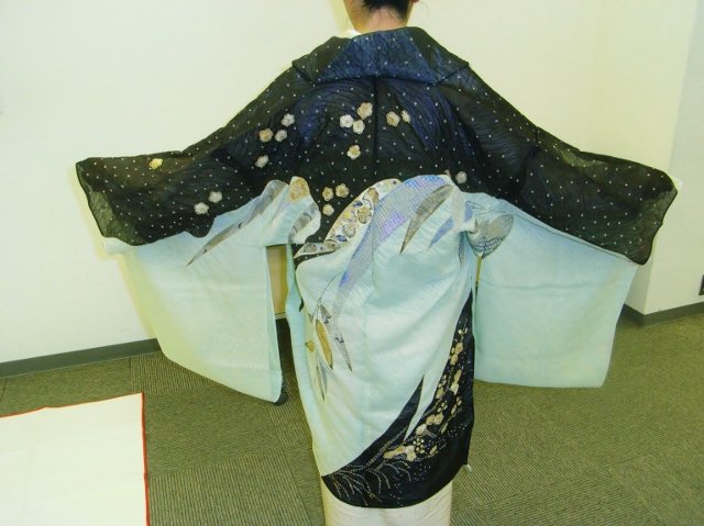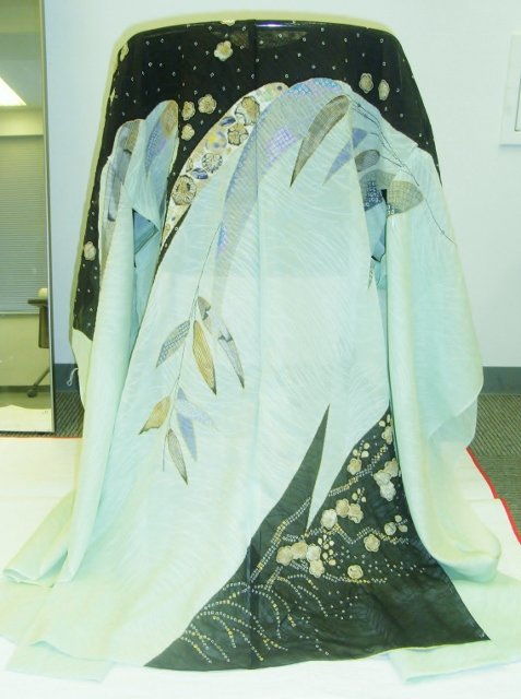 地色は、写真よりもう少し鮮やかなグリーンでとてもさわやかな印象です。肩のラインと裾の方の黒で染め上げられた部分との対比がとても素敵です。柄が分かりやすいようにためしに着てみました!仮絵羽の状態なので、襟元が不自然ですが、お仕立てをすると、もちろんすっきりときれいな着姿になりますよ。