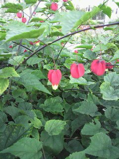 ほおずきのような赤いプックリとしたお花がぶら下がっていてかわいいですよね。この子の名前はチロリアンランプというそうです。そして、この赤いお花と思ったのは実は、萼(がく)の部分なんだそうです。ひとつだけ、赤いところから黄色い物が飛び出しているのが見えますでしょうか?